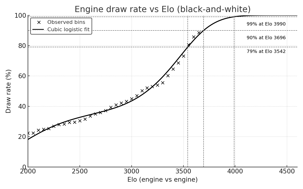 The 99 percent threshold at approximately Elo 3990 represents a modest extrapolation from the observed data. The highest bins (3600–3650) already exhibit draw rates of 86–89 percent, placing the 90 percent milestone practically within reach. Extending several hundred Elo beyond to reach 99 percent follows naturally from the fitted curve’s acceleration, which itself is grounded in the clear empirical pattern visible across the full observed range.